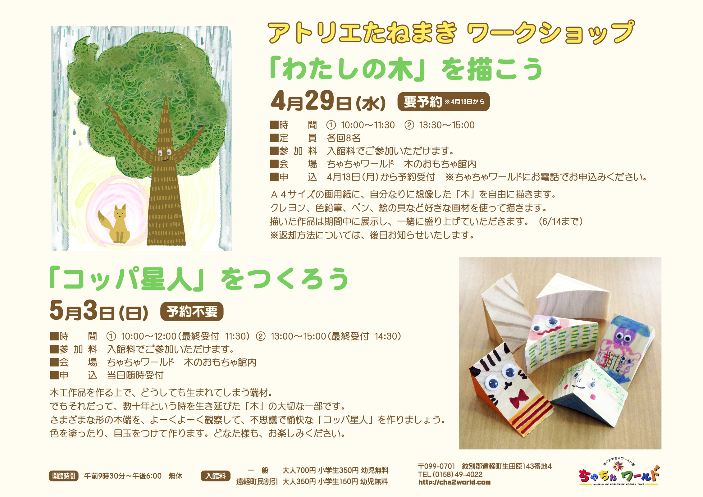 4月29日は「わたしの木」を描こう(要予約)、5月3日は「コッパ星人」をつくろう(予約不要)を開催します。