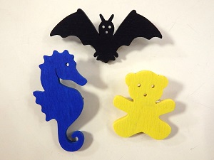 ドイツ・ヴェルナー社で作られた木製ブローチです。定番外の種類であるクマ、タツノオトシゴ、コウモリの3種が入荷しました! ひとつ396円(税込) |