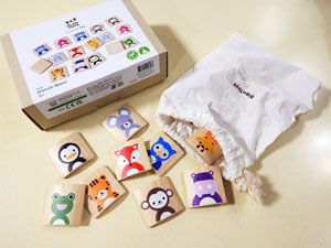 10種類の動物が描かれた木製タイルが2枚ずつ、合計20枚のメモリーゲームです。収納用のバッグも付いています。 3,520円(税込) |