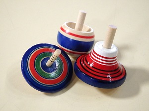 木製のシマごま、富士山コマ、逆立ちコマが入ったセットです。色の組み合わせは様々です。それぞれ遊んで回り方を比べてみましょう! 935円(税込) |