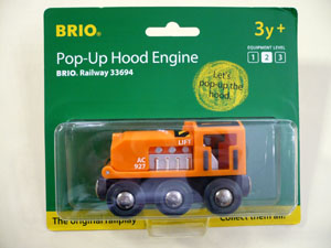 前のエンジン部が開閉可能なBRIO機関車です。フードを開けて燃料補給。マグネットで他のワゴンと接続可能です。 1,890円(税込) |