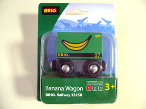 バナナコンテナを積んだBRIOのワゴン列車です。コンテナとバナナはワゴンから取り外し可能、それぞれマグネット付きでクレーンで持ち上げられます。 945円(税込) |