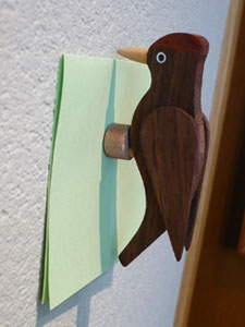 クラフトの町、東川町の鈴木工房さんの作品。 赤ゲラのマグネットですが、画鋲が壁に打っておくと壁に止まってくれます。 強力な磁石をしようしているので、メモなんかもはさんで置けます。体調は約8cmです。 |