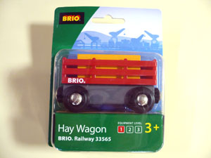 黄色の荷物が付いた赤いオープンワゴン。他の機関車やワゴンと連結したり、荷物を乗せ変えたりして遊ぶことができます。 1,050円(税込) |