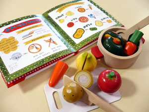 絵本と木のおもちゃがセットになった「えほんトイっしょ」シリーズです。絵本の物語にそって遊ぶことで、料理の手順や包丁の持ち方などを学ぶことができます。 3,570円(税込) |