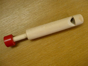 先日入荷しました~!上から息を吹くと、音が鳴ります。赤い取っ手を引いたり押したりしながら、音を出すと音階が変わって楽しいですよ♪ 500円(税込) |