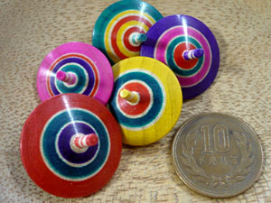 ミュージアムショップで販売されているこまの中で1番小さいこまが「ひねりごま小」。中・大と3種類あるのですが、こちらは直径が10円玉とほぼ同じか、少し大きいくらいです。ひとつひとつ手作りなので、若干大きさや色合いも違います。 315円(税込) |