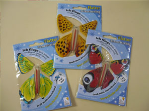 先日入荷したばかり!の、ちょっとユニークな商品をご紹介します。この蝶は、針金と紙で出来ていて、中心部に赤いゴムのようなものがついてます。針金を30~40回巻いて、本の中にそのまま挟むと、開けた瞬間に蝶が飛び立つ仕組みになっています。いつもいたずらされてうんざりしている方・・・こちらオススメいたします♪ 462円(税込) |
