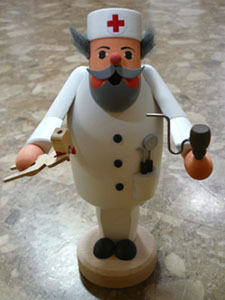 先日ご紹介した、煙出し人形の「抜歯の歯医者さん」と一緒に入荷した「お医者さんと体温計」。右手に注射、左手にパイプたばこ…。聴診器を首からさげてはいますが、やる気が…(笑) 7,980円(税込) |