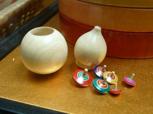 江戸独楽職人、坂間理香さんの作品。「思いもよらない事が起こる」という意味のひょうたんから駒を洒落て作られました。指の先に乗るような小さい独楽もきちんと回ります!! 3675円(税込) |