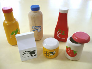 プラントイの木製ままごとセットです。キッチンや冷蔵庫と合わせて使えます。オレンジジュース、水、牛乳、ケチャップ、ジャム、はちみつのセットです。 2,940円(税込) |
