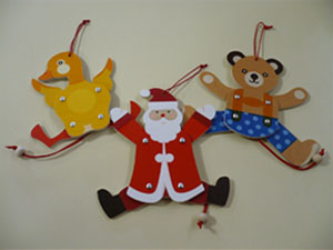 頭のひもを壁などにかけて、足の間のひもを下に引っ張ります。そうすると、手足が上下に動きます。写真に載っているものの他に、ネズミやピエロがあります。全部で7種類です。 1,260円(税込) |