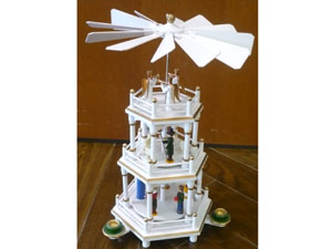 ドイツの伝統的なクリスマス玩具のキャンドルスタンド「聖誕白3段」です。ろうそくの熱でプロペラが回り、聖誕人形も回り始めます。 26,250円(税込) |