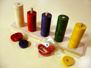 5色のリングがそれぞれ10個ずつ。棒にさしたり、色を分けたり、ヒモに通したりして遊びます。初歩の計算を学ぶ教材としても広く活用されています。ドイツ・ニック社製。 6,510円(税込) |