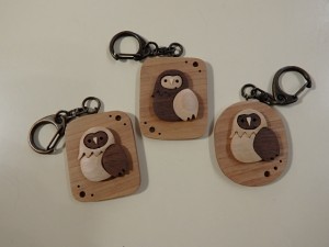東川にある、「鈴木工房」さんの商品です。木の色だけで表現された、ふくろうのキーホルダーは丸い形のものや四角い形のものなど、種類があります。一見同じように見えますが、手作りなのでやっぱり違います。お気に入りのキーホルダーを見つけてくださいね!! ひとつ864円(税込) |