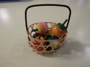 フルーツコマとバスケットがセットになっています。コマの種類は、かき・もも・なす・ゆず・すいか・りんごの6個です。どのコマもよく回りますよ~!! 2,592円(税込) |