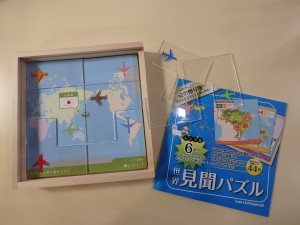 飛行機の絵がついている透明のプレートで、正方形をつくるパズルです。台紙には世界遺産や国旗が描かれているので、遊びながら学ぶことができます。 2,862円(税込) |