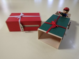 オルゴールを回して箱を開けると、勢いよく男の子・女の子が出てきます。左は、手紙を持った女の子が出てくる前の状態です。花を持った男の子のように飛び出してきます。 各5,400円(税込) |