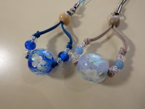 夏を感じさせるストラップはいかがですか?こちらはとんぼ玉で作られた「水中花ストラップ」です。名前のとおり、中に花が入っています。写真のストラップは、夏らしい青色のものですが、他にも色々な種類があります。 ひとつ1,944円(税込) |