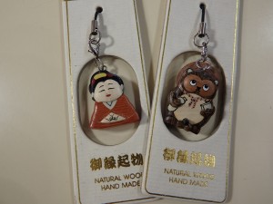 写真左側が「お福さん」、右側が「たぬき」です。他にも招き猫やだるまなどがあります。携帯などにいかがですか?? 648円(税込) |