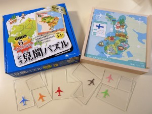 飛行機が描かれている透明なプレートで正方形を作るパズルです。プレート×6枚、問題カード×22枚(44問)の他に、世界遺産や国旗など世界の国々の特長がわかるテキストブックが付いています。付属の木箱は収納ボックスとして使えます。 2,862円(税込) |