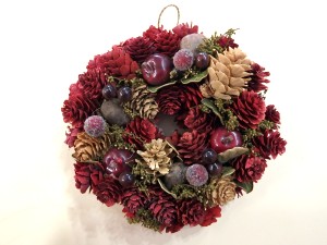 たてよこ約20センチのリースです。可愛さだけでなく松ぼっくりやチェリーなどで豪華に飾られているので、これだけで存在感抜群ですよ~!!玄関やリビングにオススメです。 1,296円(税込) |