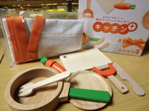 エプロン・にんじん・ピーラー・お皿・まないた・ミルクパン・ナイフ・フォークがセットになっています。はじめてのおままごとにオススメです。 3,348円(税込) |