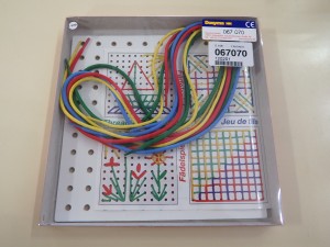 ドイツ製のボード状ひも通し遊びです。4色のひもを使いこなして色々な形を作ります。ひも4本とパターン表付き。 1,404円(税込) |