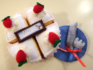 フェルト生地の苺ケーキセットです。各ピースにマグネットがついています。中心にあるチョコプレートには名前を入れられるようになっているので、お誕生日プレゼントにもオススメです! 1,080円(税込) |