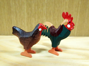 ドイツ・ヴェルナー社製のミニチュアにわとりです。木の輪からノミで削り出し、一つずつ丁寧に作られています。 各810円(税込) |