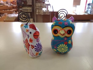 カラフルなお花がペイントされた可愛い動物たちのメモスタンドです。写真は鳥とふくろうですが、他の動物もいます。明るい色でハッピーな気分になります! 1個648円(税込) |
