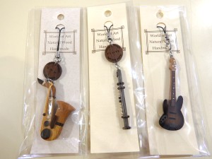 吹奏楽部やバンドなど、音楽好きにオススメ!!木製の楽器ストラップです。写真左から、サックス、フルート、ギターです。他にもたくさん種類があります!! ひとつ918円(税込) |