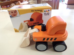 鮮やかなオレンジ色の少しかっこいいブルドーザー。黒いボタンを押すと、ショベルが持ち上がります。箱に入っているのでプレゼントにもオススメ! 2,700円(税込) |