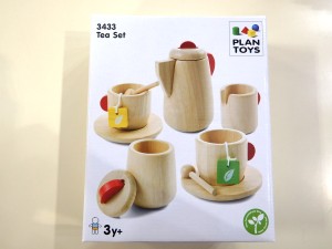 ティーポット・砂糖入れ・ミルクの瓶が1つずつ、ティーカップ・受け皿・ティースプーン・ティーバッグ・砂糖が2つずつ入っています。ごっこ遊びなどにプラスすると、遊びの幅が広がりますよ~!! 4,536円(税込) |
