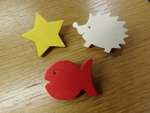 木で出来た可愛らしいブローチです。写真のはりねずみなどの動物をはじめ、星やハートなどさまざまな形のブローチがあります。 ひとつ270(税込) |