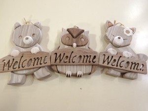 「Welcome」と切り抜かれたボードを持った、クマ・フクロウ・キツネの壁掛けです。大きさは、たて約12~15cm×よこ約10cm。玄関やお部屋に♪ ひとつ1,000円(税込) |