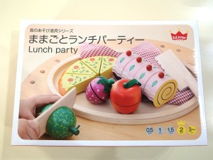 パーティーにかかせないピザ・ケーキの他、メロン・イチゴ・リンゴの果物を大皿に入れ、2種類の包丁とチェックのクロスを加えました。ままごと遊びは想像力を高め、お子様の社会性を豊かに育てます。 3,780円(税込) |