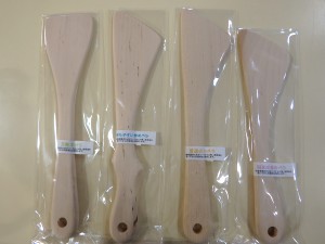 ずっと握っていても負担にならないような優しい手触りです。無塗装のため、合成樹脂での塗装など気になる方にもオススメです。左から、万能、持ちやすい、普通、短めのヘラ。 ひとつ648円(税込) |