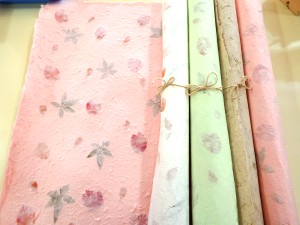 「サー」という木の皮を手作業ですいた紙です。手作業のため、一枚一枚、微妙に柄が違います。大きさは53cm×80cmです。色は白、緑、ピンク、茶、青、紫があります。 一枚324円(税込) |