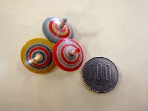 100円玉より一回り小さいサイズでも、よく回ります。独楽職人の坂間理香氏がひとつひとつ丁寧に手作りしているので、色合いや若干大きさに違いがあります。お気に入りのこまを見つけてくださいね! ひとつ432円(税込) |