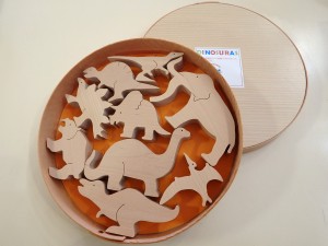 北海道産カバの木を使用して作られた、恐竜のセットです。トリケラトプス、ティラノサウルス、インペリアルマンモスなど9種類の恐竜が無塗装で入っています。 4,800円(税込) |