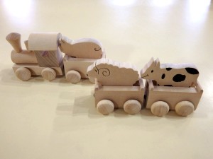 可愛いブタ・羊・牛が乗っている木の電車です。マグネットで連結しているので簡単に順番の入れ替えや取り外しも可能、動物たちの取り外しも出来ます。 1,080円(税込) |