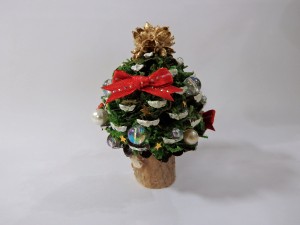 松ぼっくりで作られた高さ8cmほどの小さなツリーです。ビーズやリボンで装飾されています。 550円(税込) |