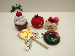 先日ご紹介したパトカーや消防車のオーナメントと一緒に入荷したものです。カップケーキやロールケーキなどがモチーフになっています。 ひとつ550円(税込) |