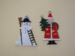 直径約7~8cmほどの大きさのオーナメントです。約300度で溶け出す錫を、型に流し入れ、冷めたら型から取り出し、彩色と研磨を行ってオーナメントが出来ています。 サンタ2,200円(税込)・雪だるま1,980円(税込) |