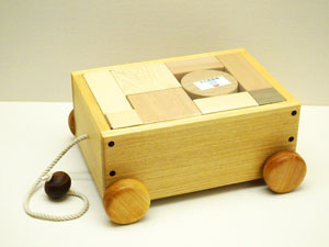 工房RYUさん製作の積木です。白木無塗装のブロックが20ピース、タイヤ付きの木箱に入っています。 13,200円(税込) |