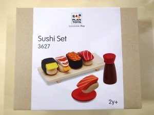 いくら、たまご、えび、まぐろ、サーモンに、2枚ののりが付いています。すし下駄、しょうゆ、しょうゆ皿もついていて、すし職人になりきって遊ぶことができます。 4,950円(税込) |