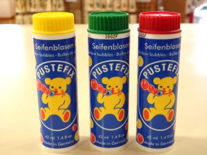 どこにでも持ち運びしやすいミニサイズのシャボン玉です。フタの裏に吹き口がついています。ドイツ・プステフィックス社製。 ひとつ176円(税込) |