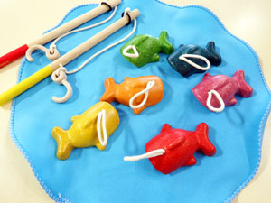 6匹のカラフルな魚と池、釣りざおが2本付いているプラントイの魚釣りゲームです。釣りざおはひもの長さを変えることで難易度を変えられます。 3,300円(税込) |