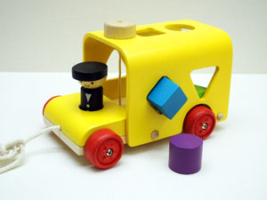 3色の形合わせとプルトイを組み合わせた玩具です。バスの上の白木パーツを引っ張ると、ブロックが後ろから出てきます。 6,490円(税込) |